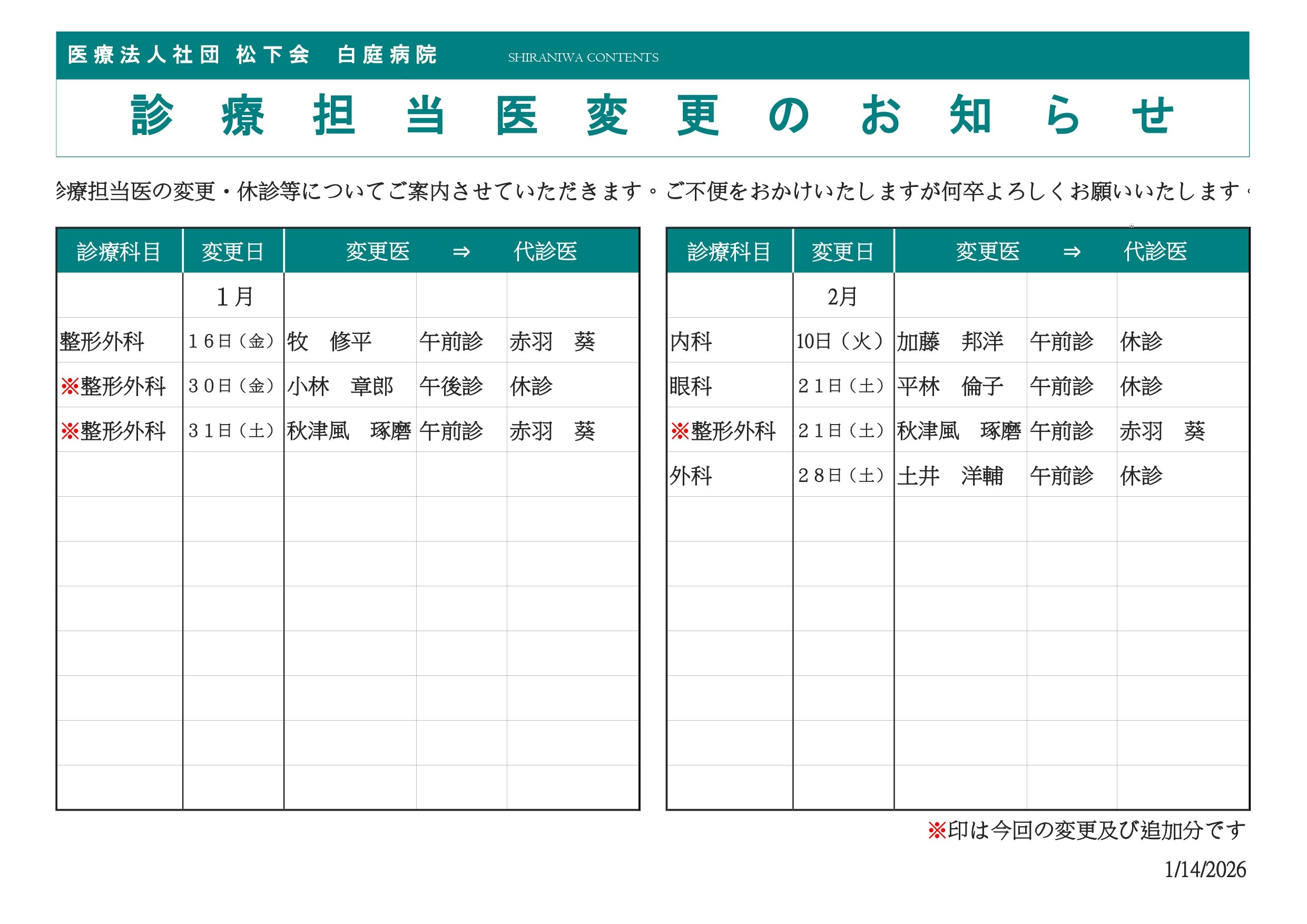 休診・診療担当医変更のお知らせ
